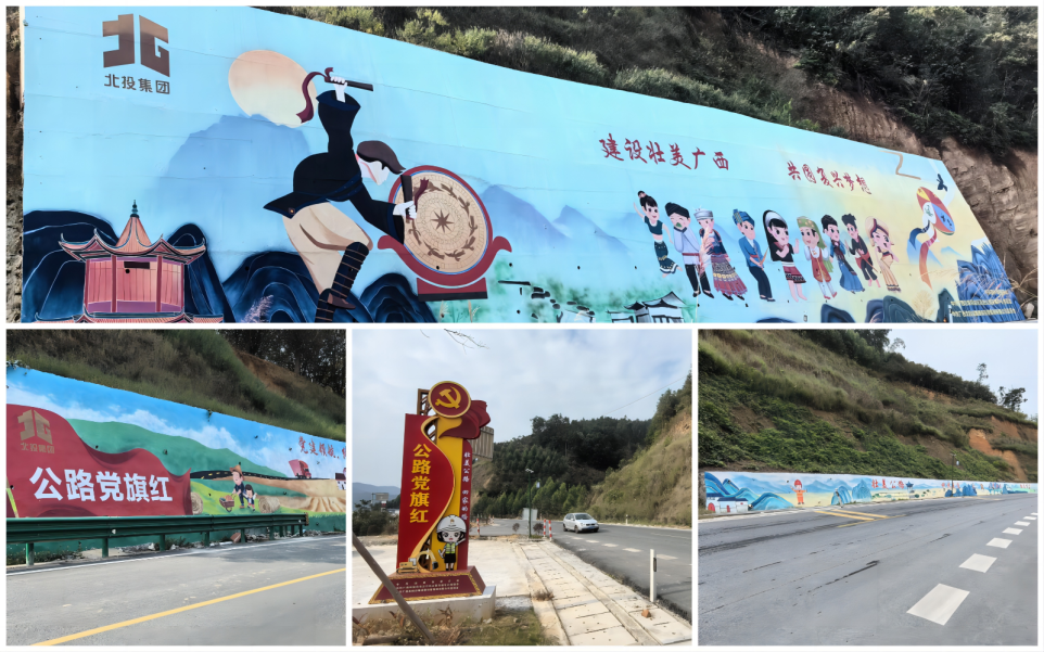 建設辦聯合田林縣委和百色公路發展中心,以大地為紙、公路為筆,將民族元素和公路特色以及“公道業成 路通萬家”的美好愿景寄情山野,擋土墻面、候車亭上、平交路口……目光所及之處,自然景觀和人文風俗和諧相融,壯美公路與田園屋舍相映成趣,一幅“民族團結一家親、鄉村振興一條心”的幸福圖景正徐徐鋪展。