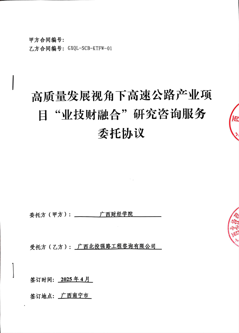 4月24日,強路公司與廣西財經學院簽約《高質量發展視角下高速公路產業項目“業技財融合”研究咨詢服務委托協議》。這是強路公司首次與高校建立“課題”研究戰略合作,標志著強路公司在深化產學研融合,參與推動“業、企、校”高質量協同發展邁出了重要一步。